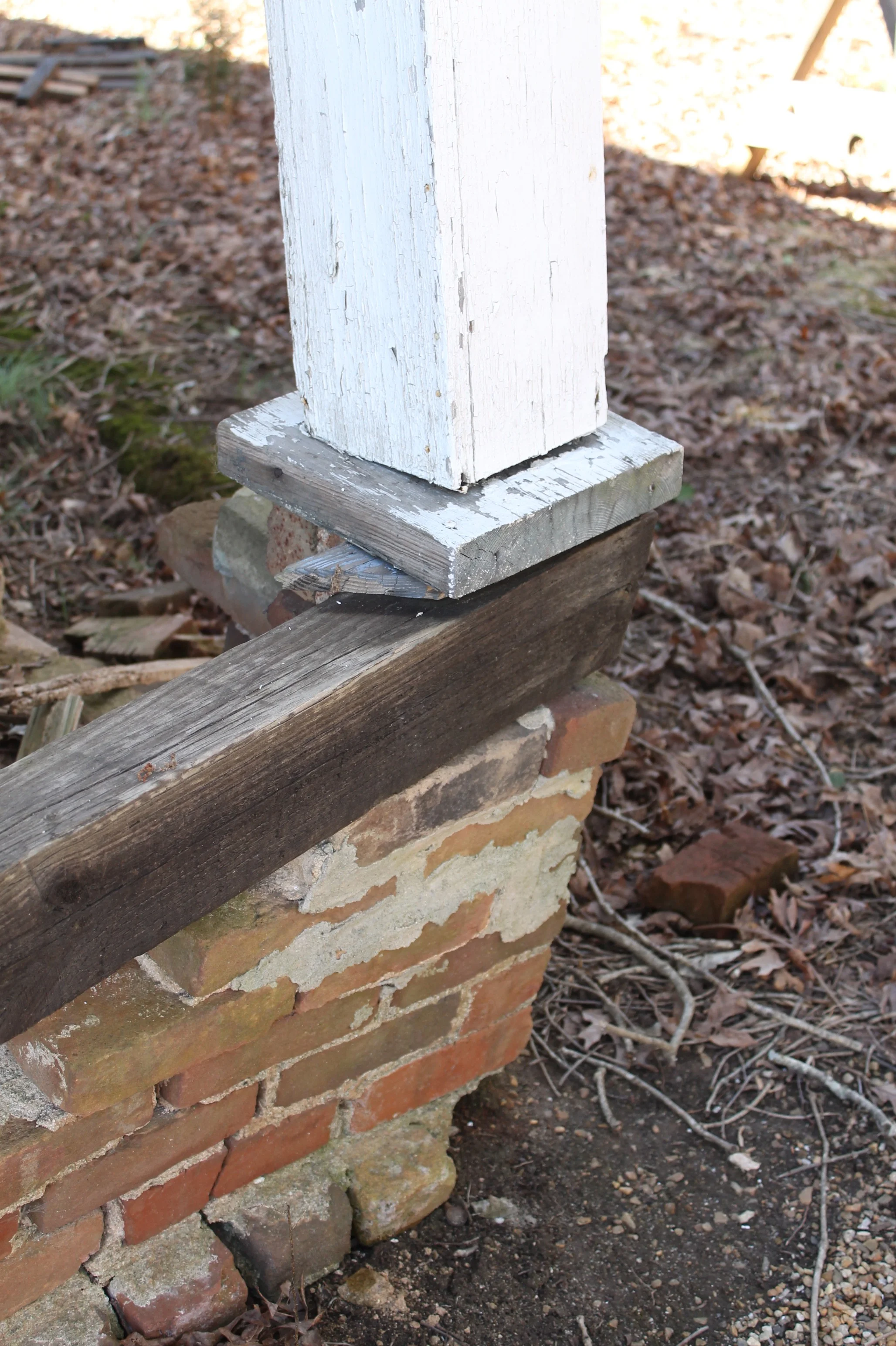 Every time Brian and I head for the Myrtle House, my first comment is, "I hope it is still standing." Dramatic sounding? Definitely. A valid concern? Unfortunately, yes. You see, the back of the house has been teetering on a pile of about five corroding bricks. There is a support column that is holding on by a thread. If it fell and was not properly supported, it could literally take down the back of the house - roof and all. So, as you can imagine, getting this post was one of my top priorities! Brian searched for a video on the proper way to create a temporary support (how did we learn anything before YouTube?!) and then he got to work.