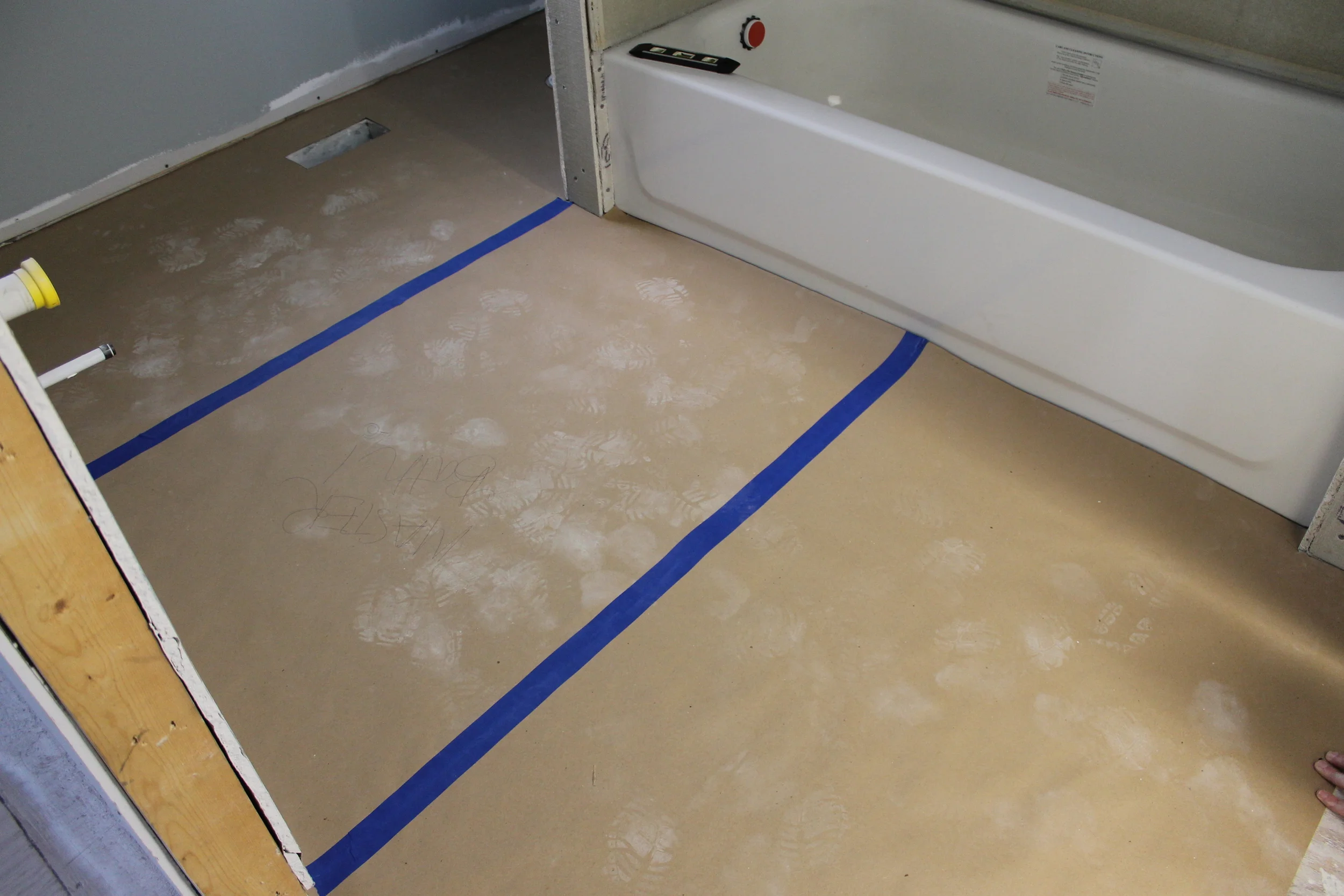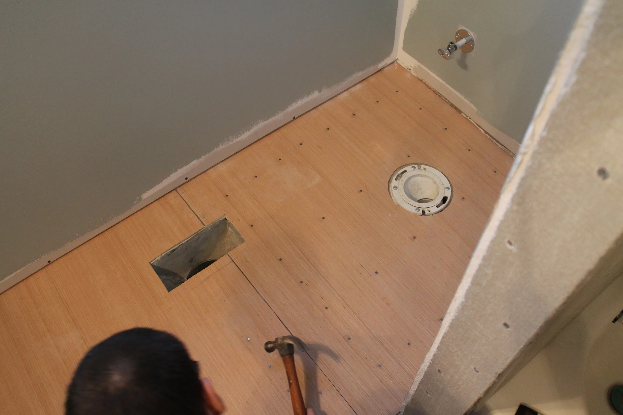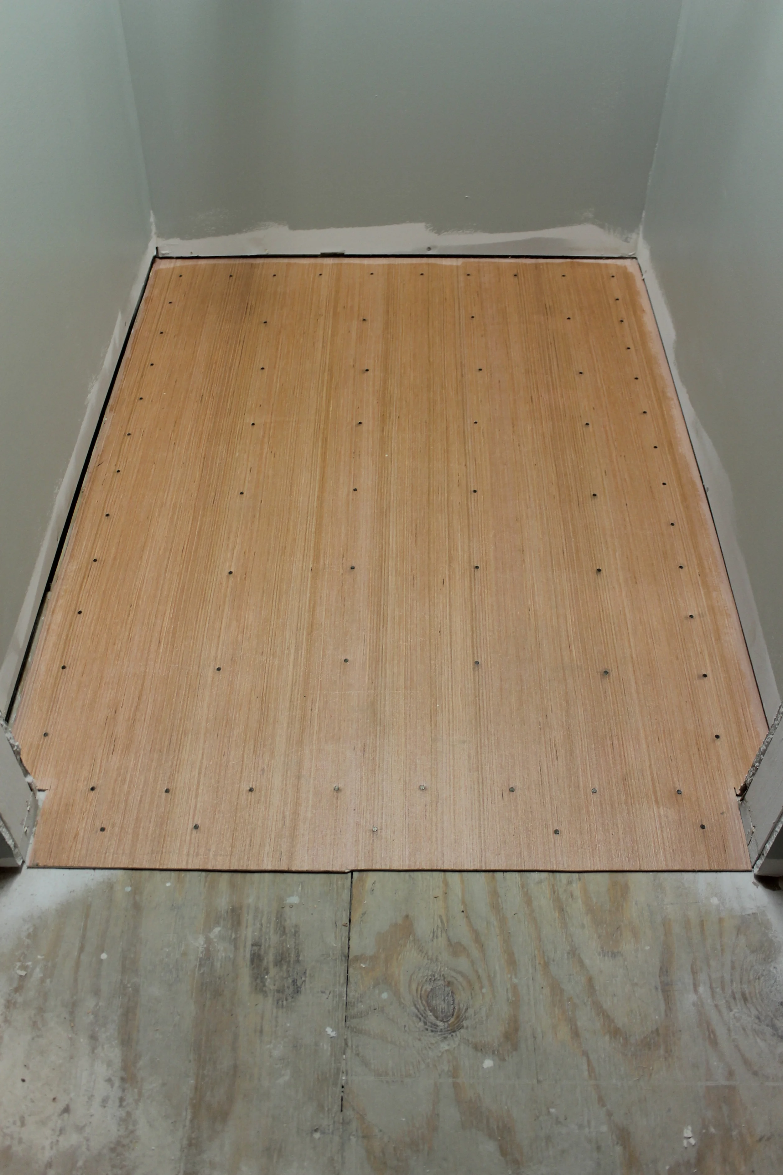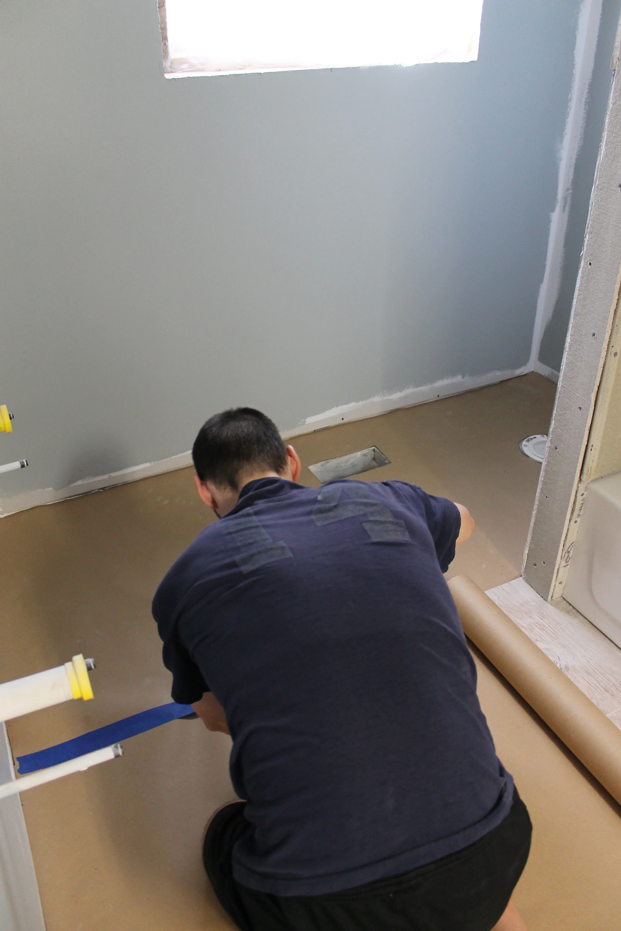 You will want to make sure the subfloor you are putting the new vinyl on is well-prepped. If you are putting vinyl over existing vinyl, then you can skip the new subfloor step. I would, however, recommend cleaning the existing vinyl VERY well (sweep, vacuum, mop, repeat). If you are like us and working with plywood subfloors, you will want to lay down another layer of subfloor (I know, trust me, I fought Brian on this step, too) in order to ensure that the surface the vinyl will lay on is free of imperfections that might show through. Any bumps, dips, or seams surprisingly WILL show through, and after doing all of this work, that is the last thing you want.