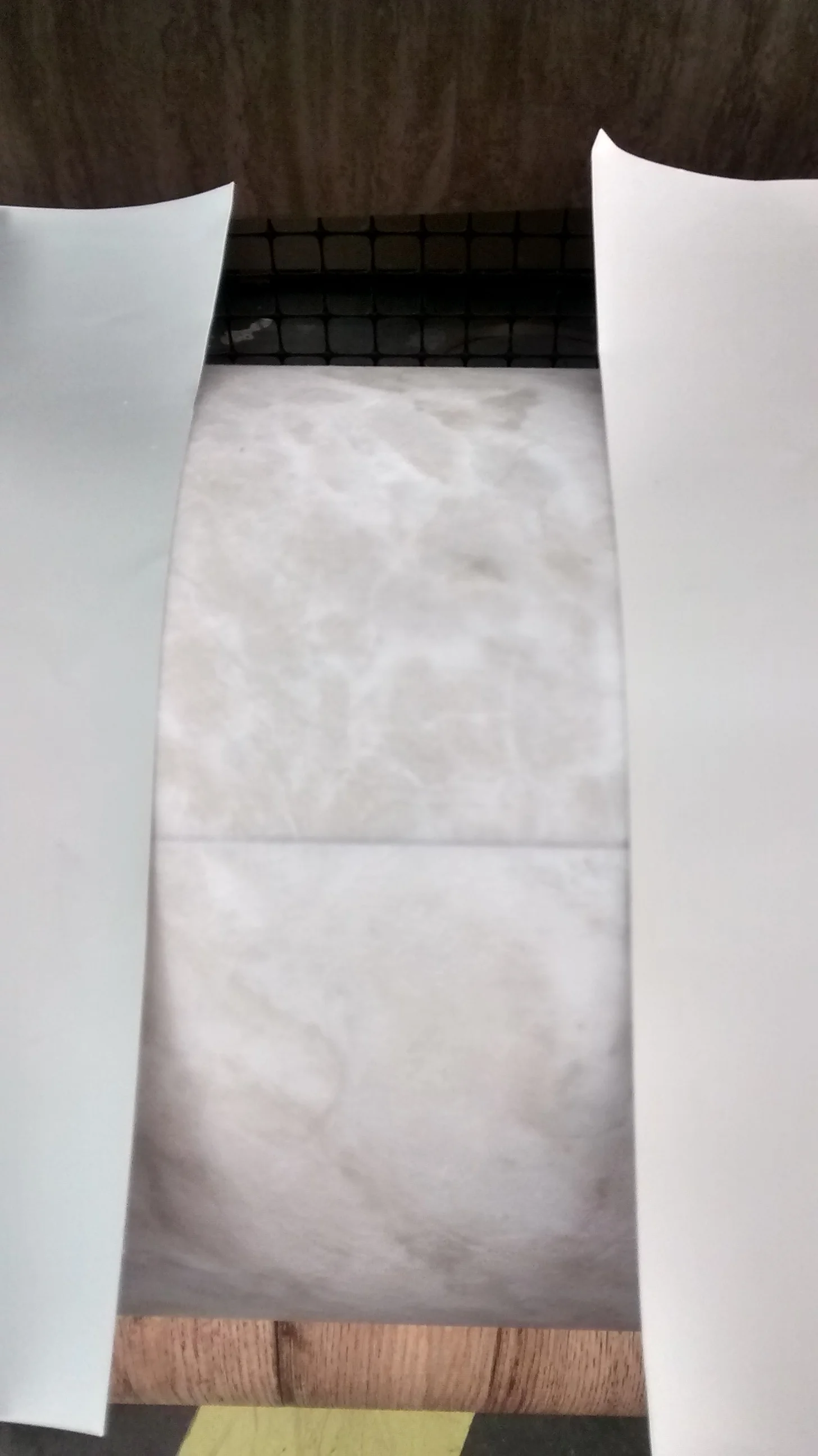 Once everything is cut out, roll your vinyl up to make installation a bit easier. Starting in the corner, place the flap of the vinyl that is not rolled in place on the adhesive, and then slowly start rolling out. If the vinyl becomes unaligned, simply peel it back up, and start again. We used a scrap PVC pipe like a rolling pin to smooth out any air bubbles.
