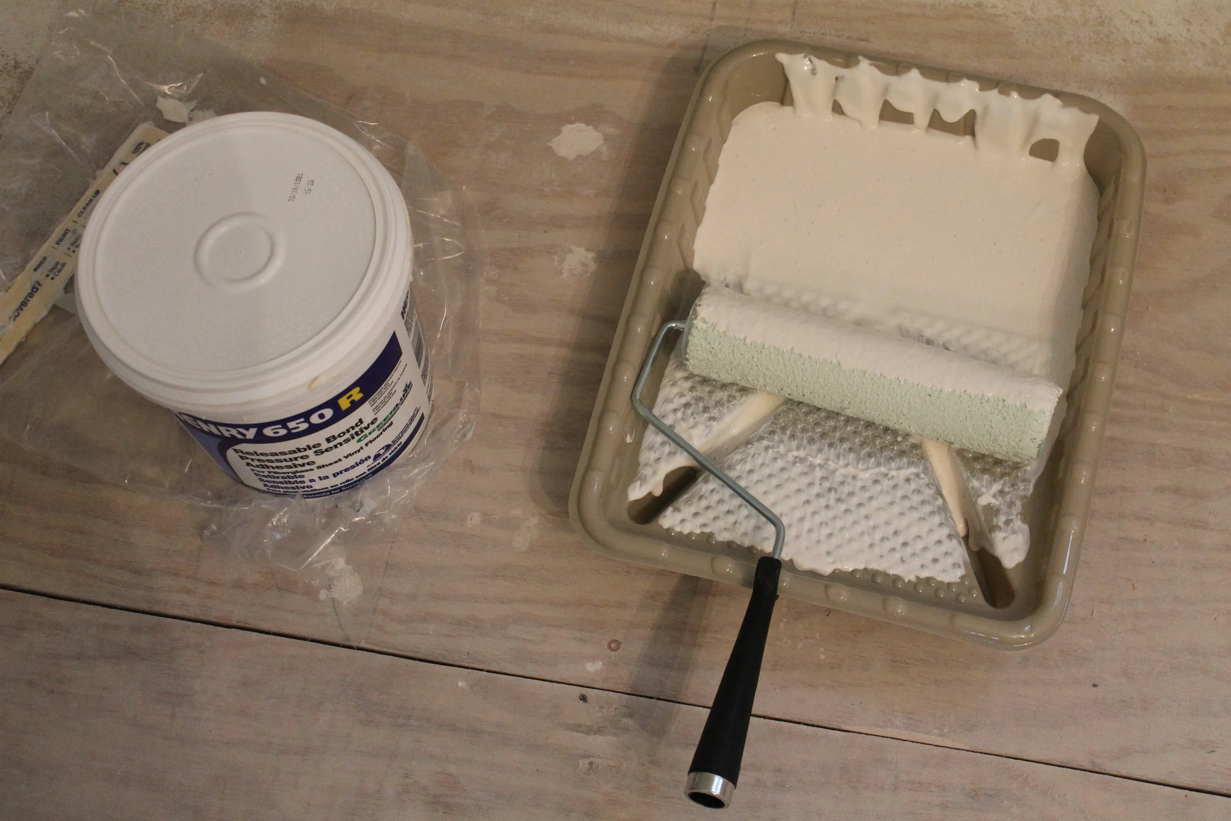 Roll the adhesive onto the floor just like you would roll paint on the walls. I would try to get as close to the edges as possible. Let this set for 45-60 minutes until it is tacky.