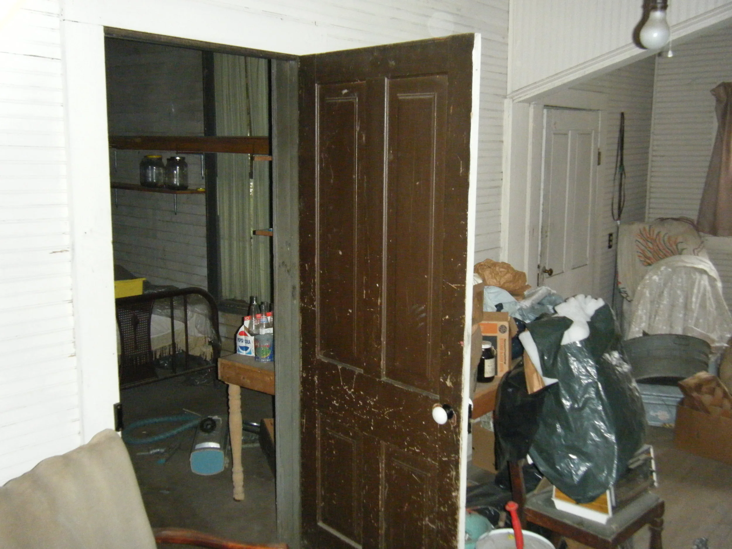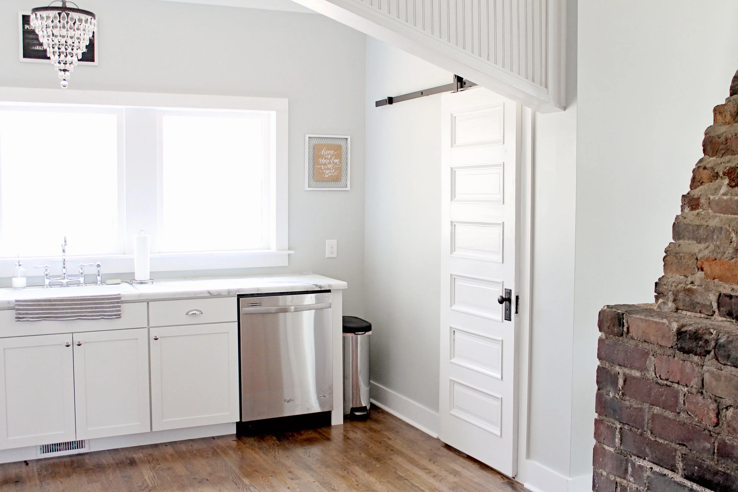 This room was gross. There were rodent nests, termites, rotten floors, and dingy replacement windows. We replaced the outdated windows with vintage wood ones on the cheap. We also re-purposed an original door as a barn door to the new pantry.