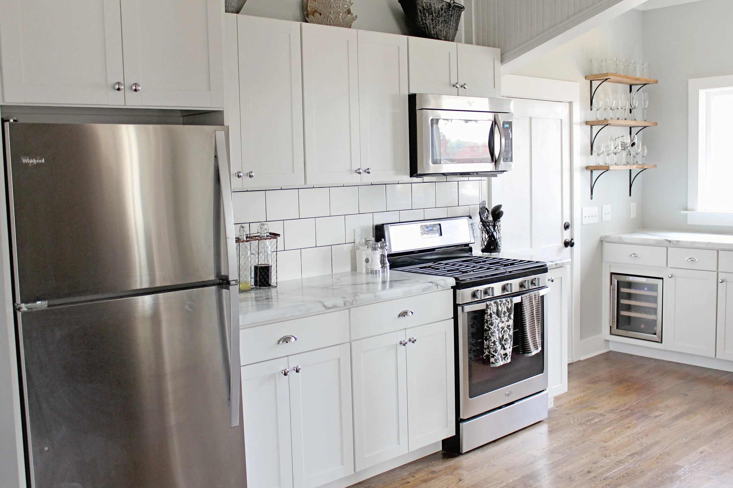 Not to be a broken record, but by the time we got to finishing out the kitchen, we had basically no money left. Marble countertops, stately range hoods, and custom cabinets were simply not going to happen. We went with Formica faux marble laminate countertops, stock white shaker cabinets, over-sized subway tile backsplash, and lower-end stainless appliances. It gave us the aesthetic we wanted (and durability) at a fraction of the cost of the Pinterest perfect kitchen.