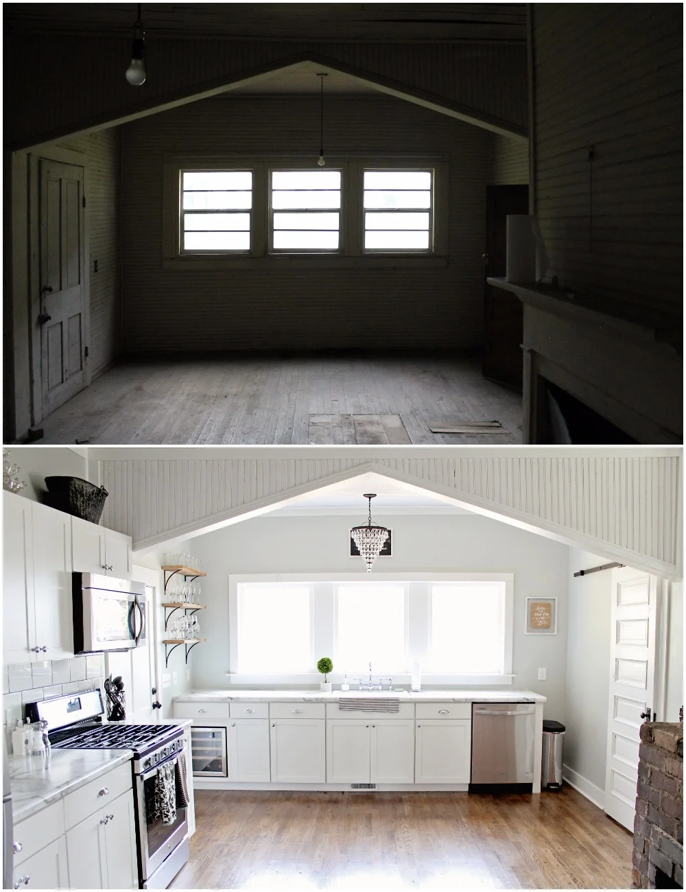 As you may have spied from the new dining room photos, the new kitchen now connects to it. Before, the old kitchen was towards the back corner of the house (now the master bedroom) and not in the best location. The new kitchen space was once used for storage, but it is in the heart of the home, has the big double-sided fireplace, and connects to the back porch (a soon to be al fresco dining area), so it seemed like the perfect spot for a new kitchen. Another bonus - it is the biggest room in the house.