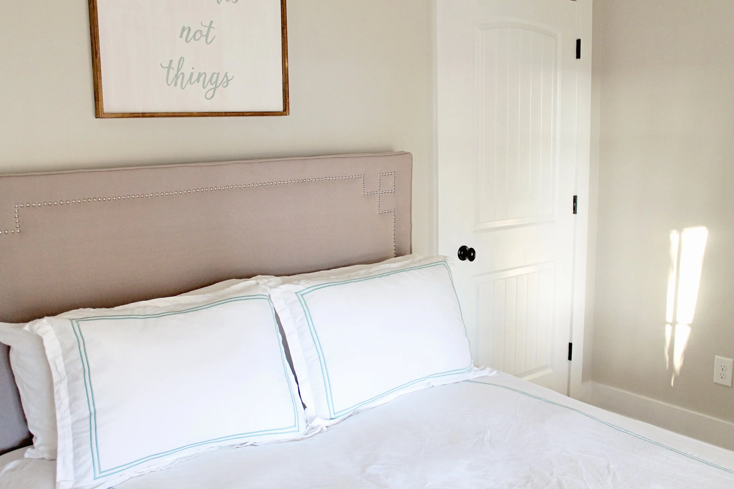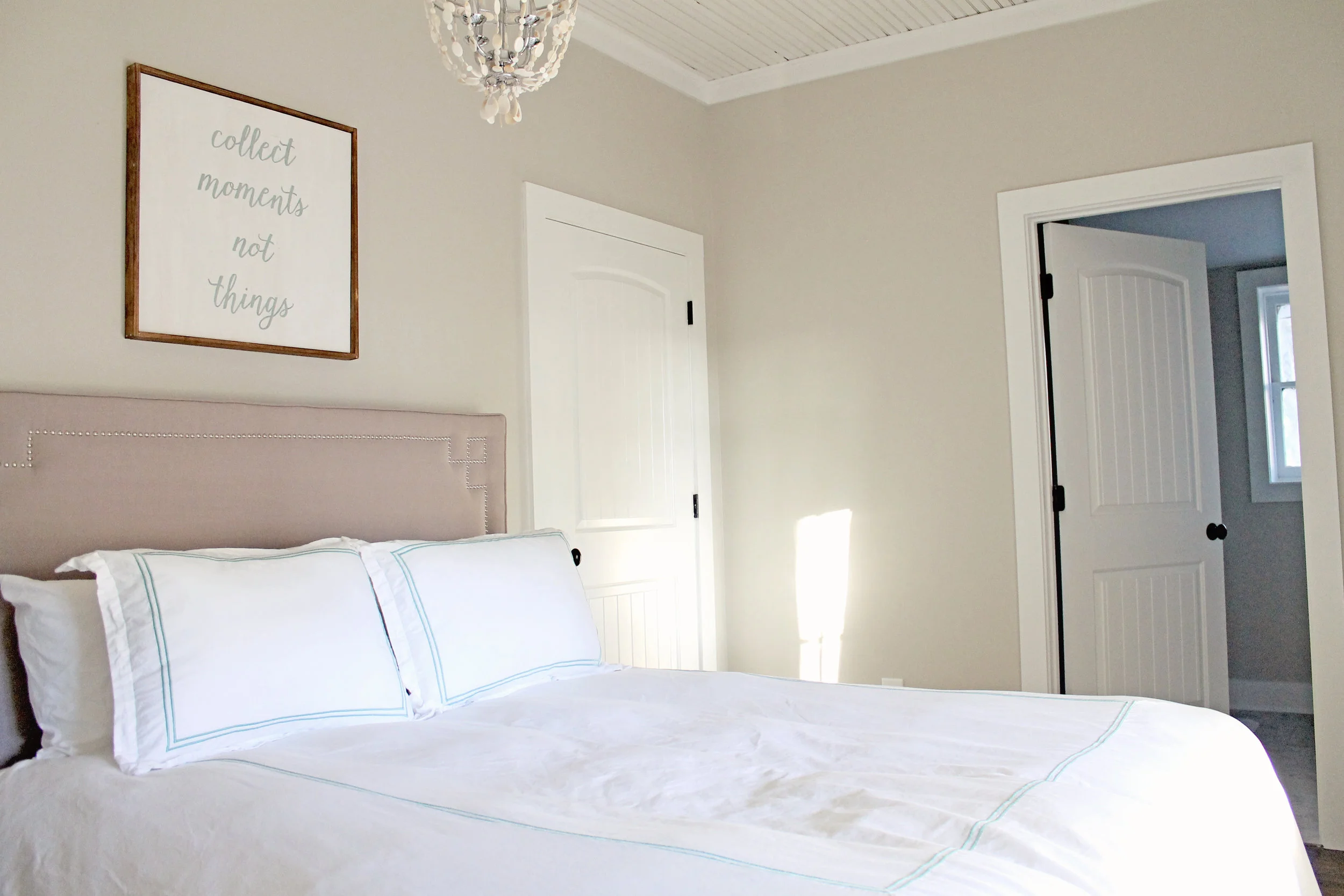 The taupe headboard and hotel-inspired duvet were both Target clearance finds. The little "Collect Moments Not Things" artwork above the bed was a quick DIY project by yours truly. We also created one of those WIFI password frames and it has come in handy! I used this template in case you are interested.