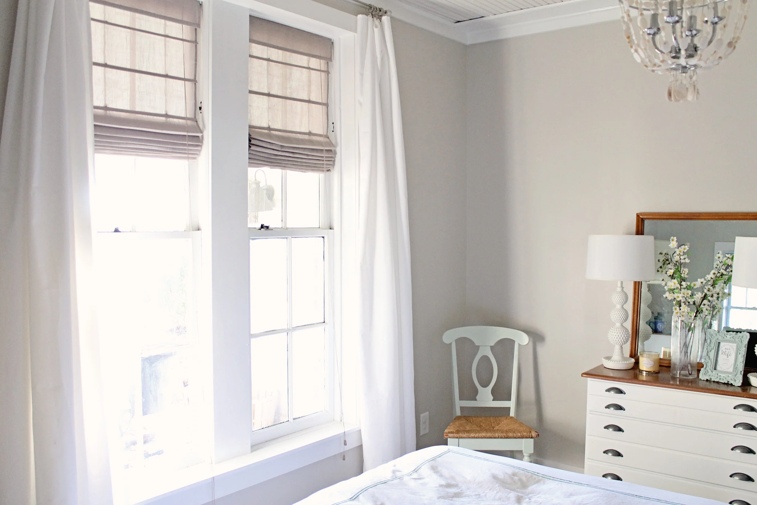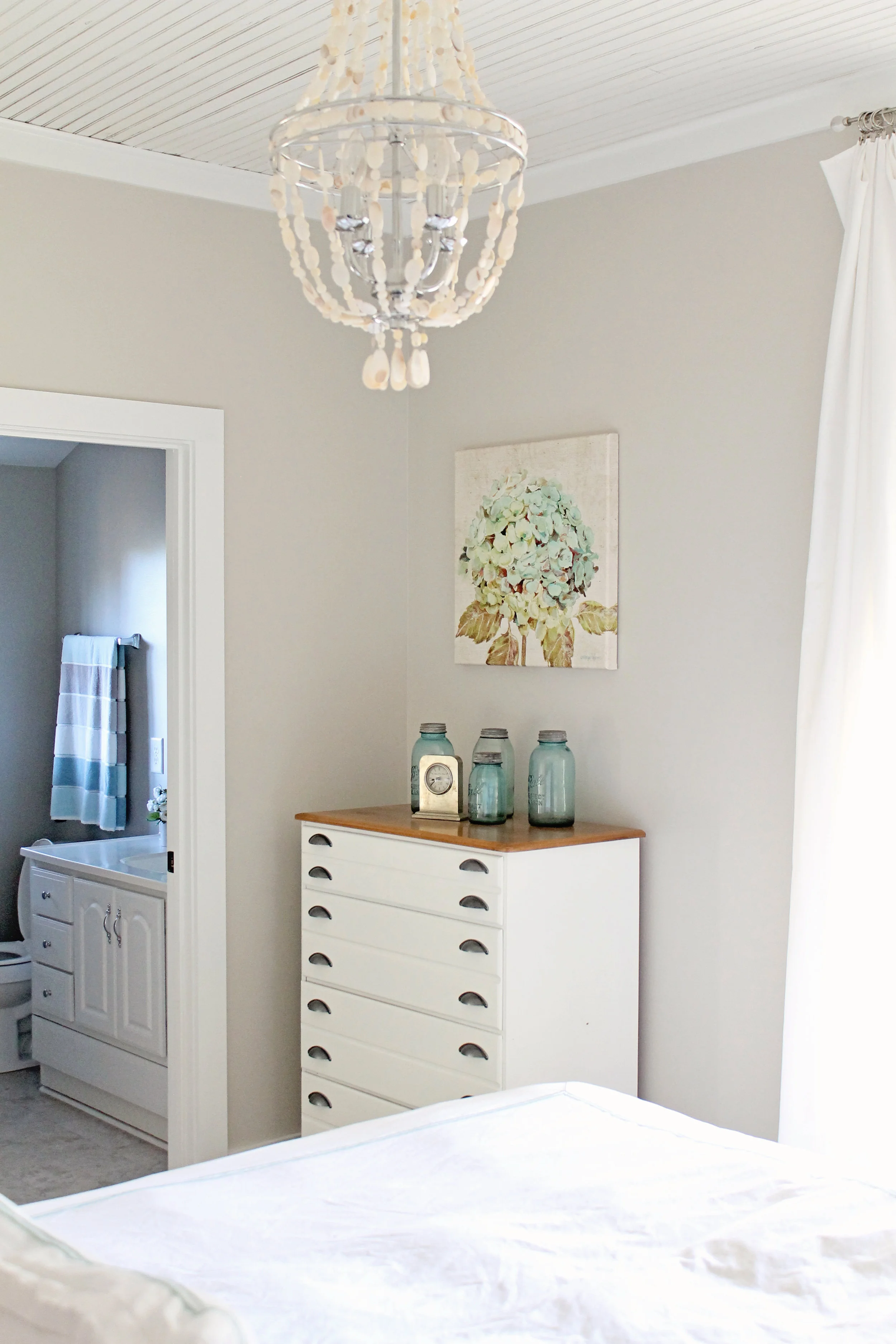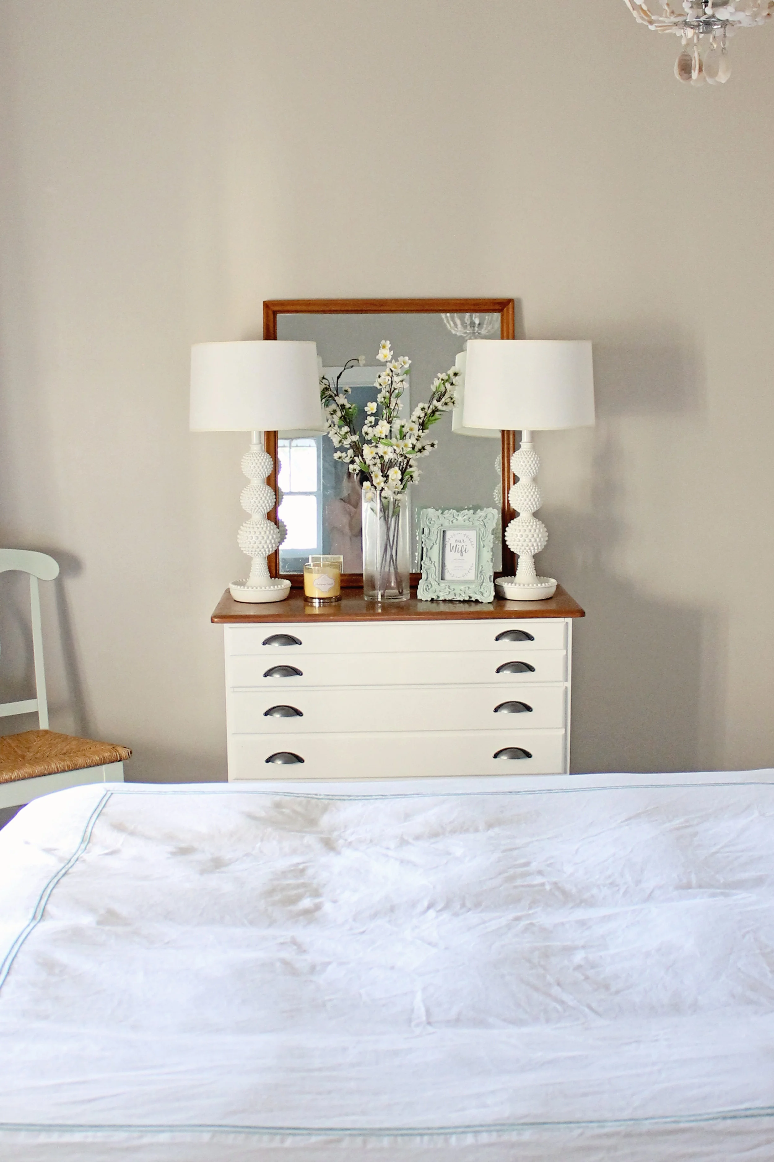 A lot of the furniture in this room is sentimental. The dresser and chest were my mom's when she was a little girl. I added some paint and new hardware to breath new life into the set. The little side chair in the corner was an extra from our family's beach place that was recently sold. The aqua mason jars belonged to Brian's grandmother and even the cylinder vase holding flower branches has a special memory as one of our wedding centerpieces.