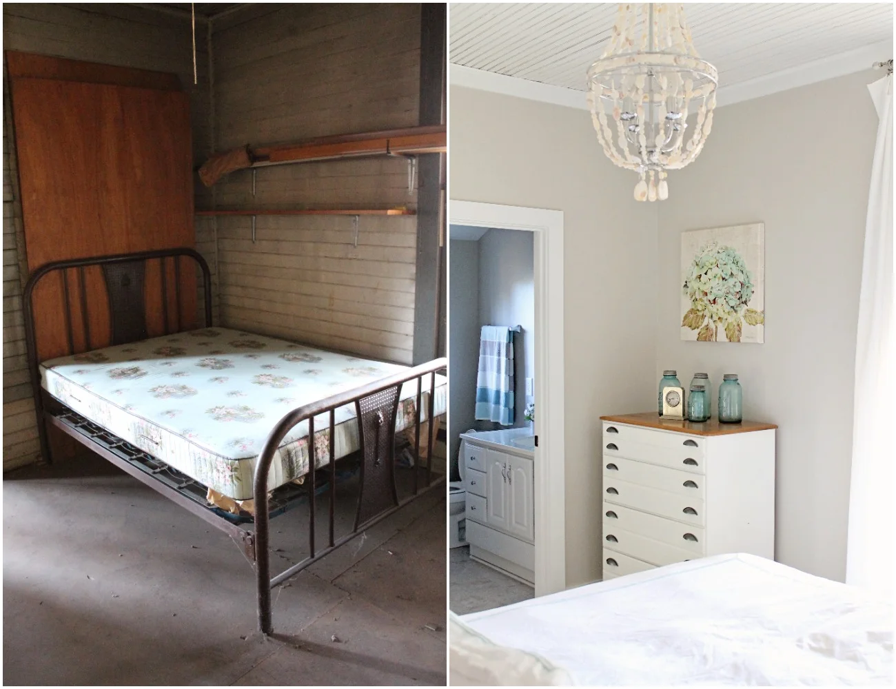 The guest room was one of the worst rooms in the house, hands down. The floors had rotted through and someone had patched it with cardboard (!!!) at some point which, of course, basically turned to mush because it is cardboard.... Anyway, as with all of the rooms in the Myrtle House, this one was gutted top to bottom. New joists, subfloor, framing, drywall, electrical, hardwoods, trim, doors, paint, etc.