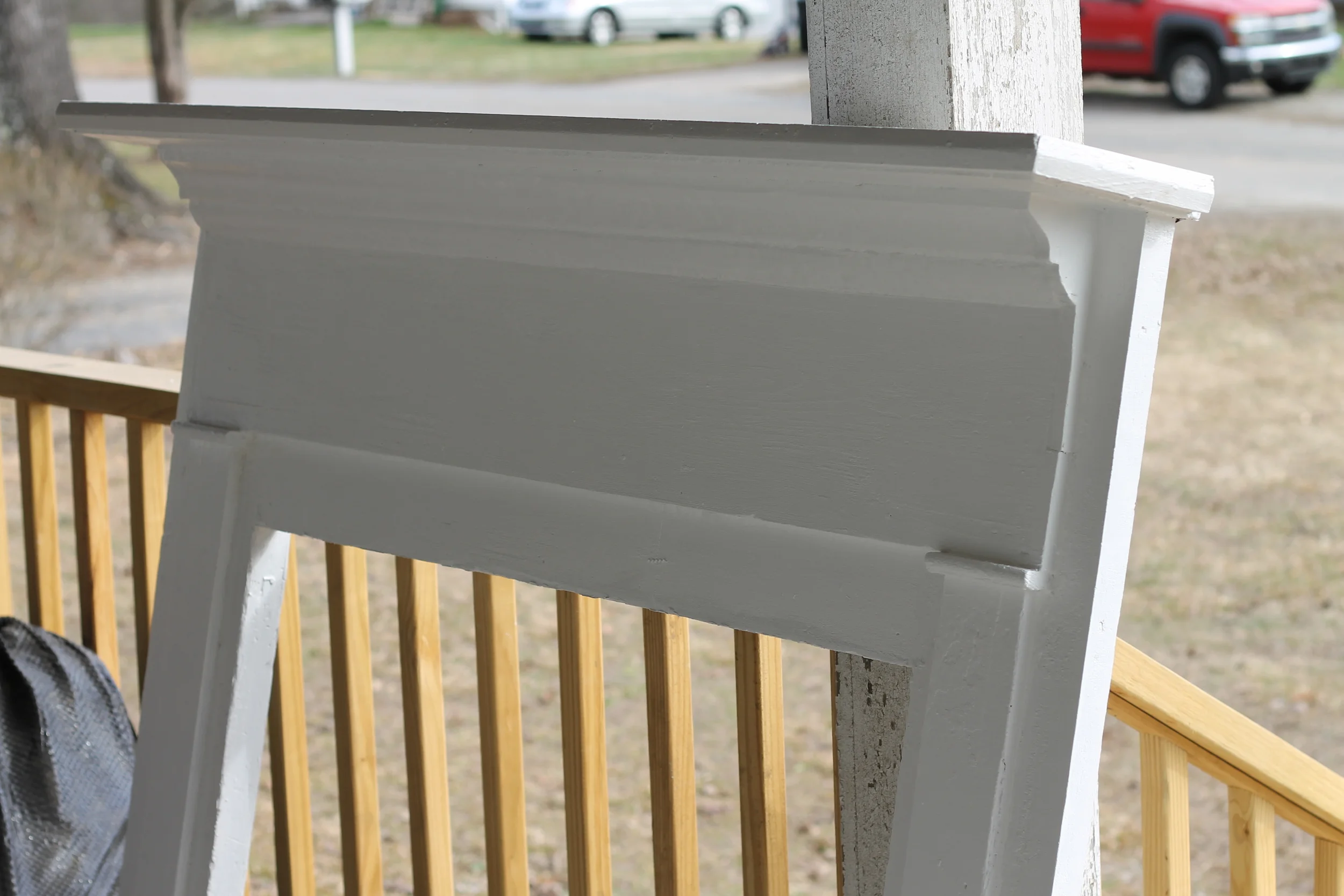 I know I have probably mentioned 101 times how bummed I was to lose the crumbling fireplace at the Myrtle House. With a $6,000 price tag to repair, it was way out of the budget for this little town. So we opted to demo the brick, repurpose it as a walkway, and place siding over the hole where the fireplace was. Since we were able to salvage the original oak floors, we had an empty area where the brick hearth used to be. We still had three original mantles from the house (one where the demo-ed fireplace used to be and two from the now exposed double-sided fireplace). I took one of the mantles, sanded the heck out of it, then repainted it.