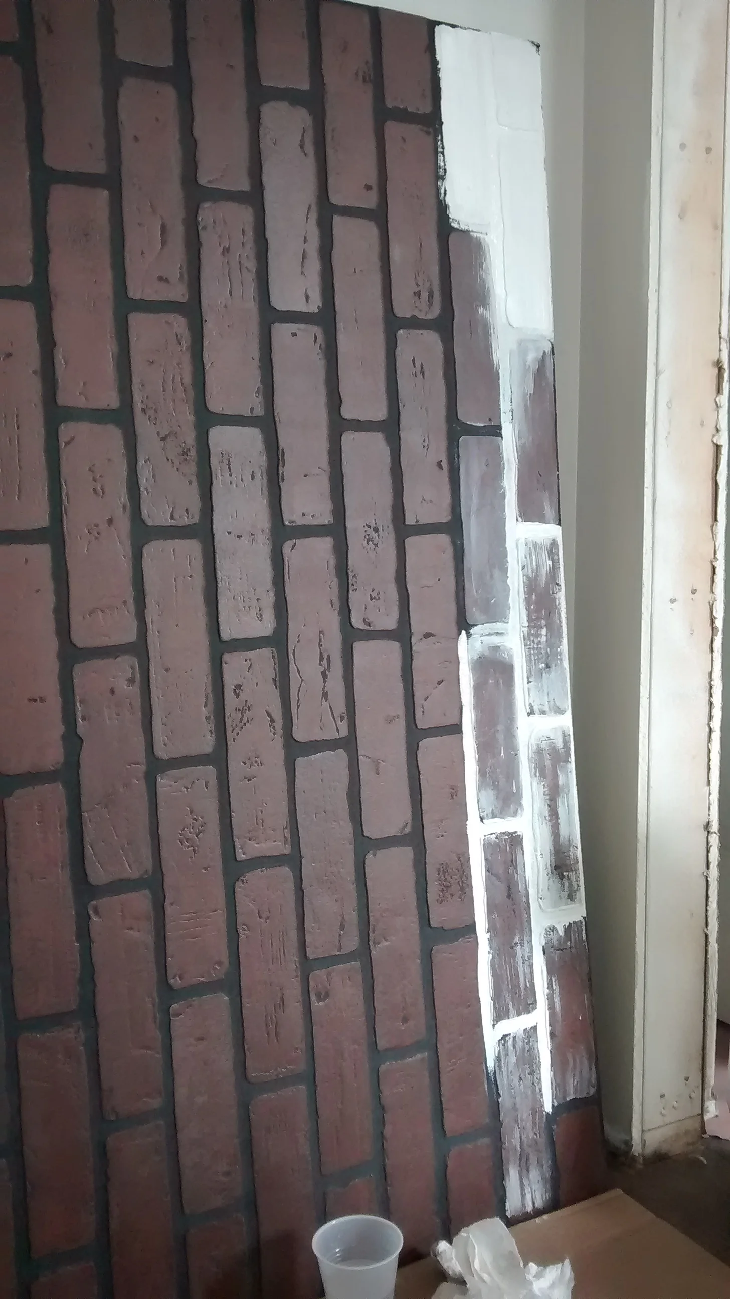 I wasn't crazy about the super dark red brick color and black grout, so I tested some painting options on the panel before cutting the sections down to size. Bright white paint seemed too stark and unrealistic, so I grabbed leftover wall paint tinted Agreeable Gray and that did the trick. The gray paint looked more like grout and gave a softer contrast. I paint the grout lines first and made sure to follow the uneven edges of the brick so it didn't look super fake. I then dry brushed the paint onto each brick making sure to get paint into the nooks and crannies. I used a paper towel dipped in water to remove excess paint and give the brick a white washed effect. I tried to vary the amount of paint each brick received for a less perfect finish.