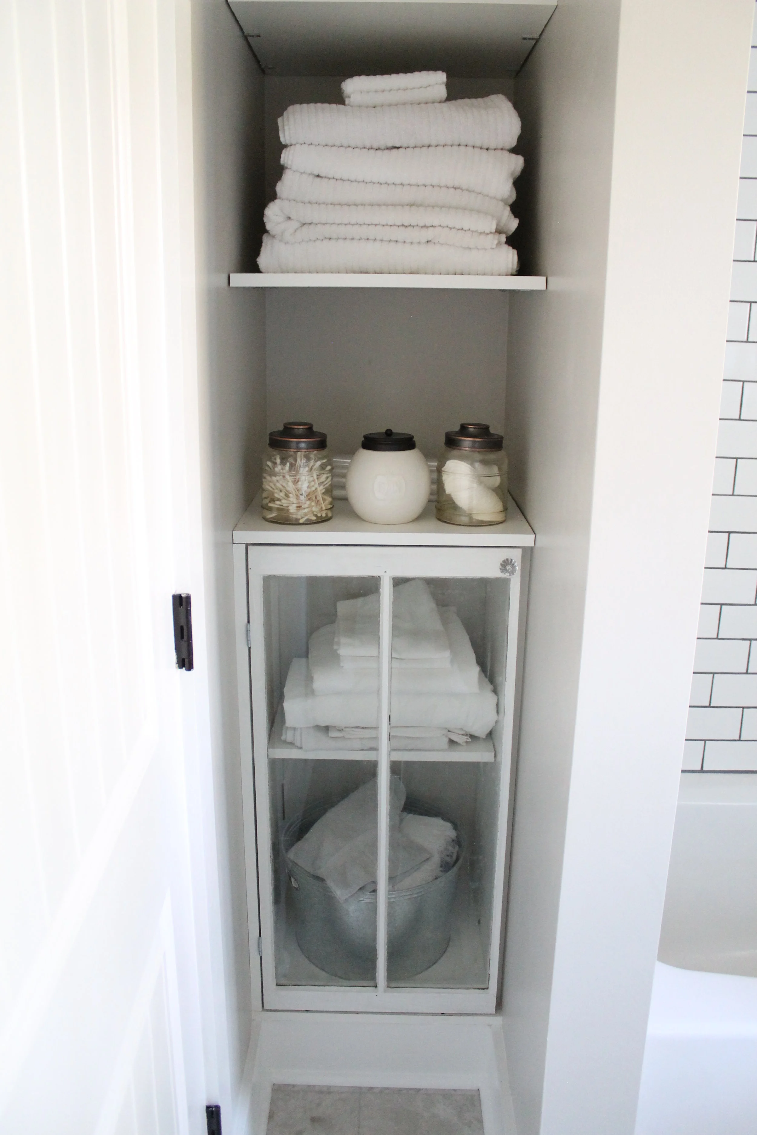 We also had this little nook between the tub and the bedroom wall that I wanted to use for shelving and storage. As we all know, built-ins mean cha-ching, cha-ching, so we looked for other options. I had been saving/hoarding this little window and we discovered that it was almost the exact same size of the opening! We had to trim it down just a hair on the table saw, but after some paint and pairing it with leftover melamine shelving, we had our own little diy bathroom built-in! The best part? It only cost about ten bucks in hardware.