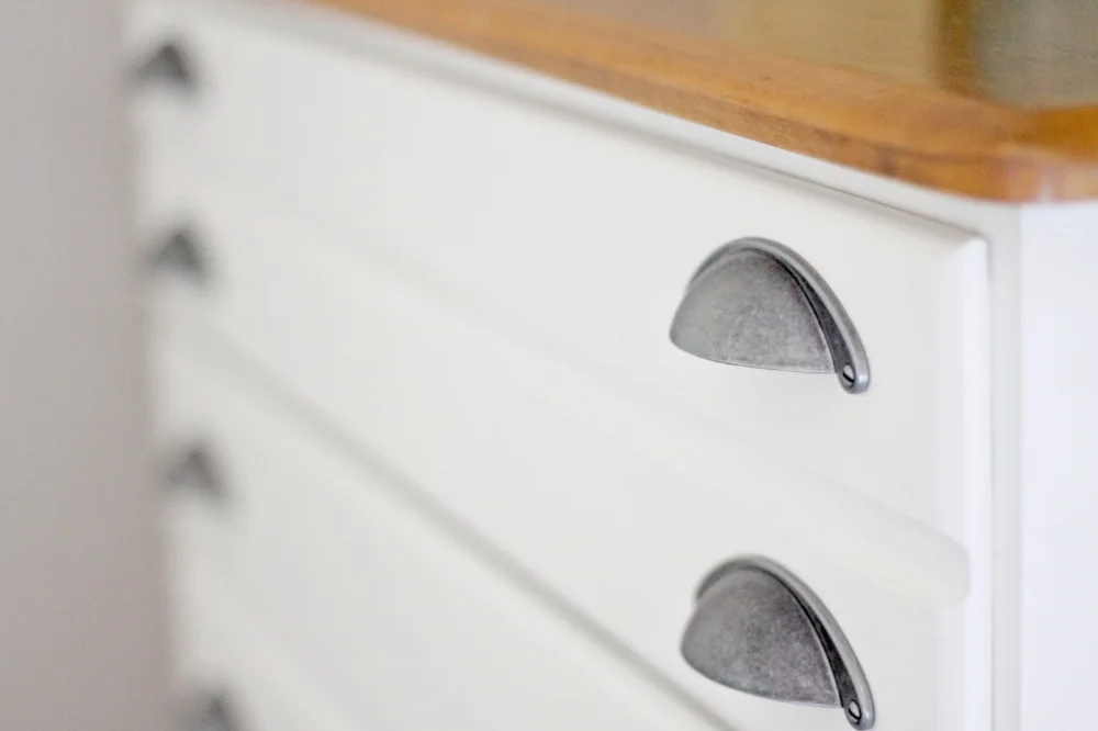 Lastly, I updated the original hardware with antique pewter pulls from DLawless Hardware. The antiqued finish matches the age of these dressers perfectly.