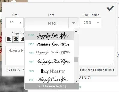 I lost track of time previewing the fonts on the card because it was so hard to pick a favorite! Check out some of these gorgeous options below. You can see how you can also customize text, size, line height, alignment, and position on the card.