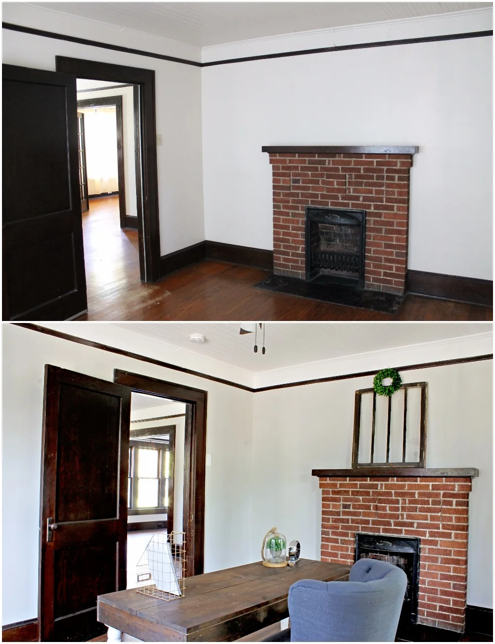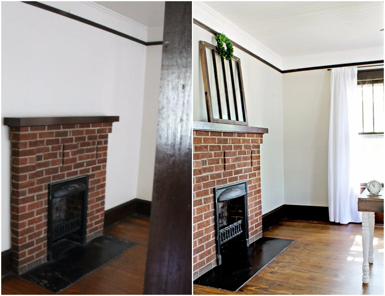 The fireplace didn't need much attention except for a shiny coat of black paint on the hearth. It was previously painted, but the paint was peeling. You can also see the refinished floors in the below photo. I think the new stain colors complements the brick a little better instead of competing with it.
