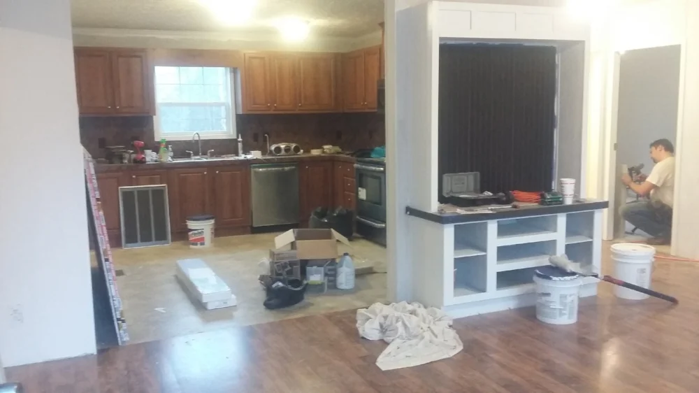 Here is a before and messy in progress shot of when you first walk into the house (walls are just primed in this photo). Sorry for the terrible phone pictures. Not a huge transformation, but I think the stainless appliances and laminate flooring make this investment property seem a little more up to date.