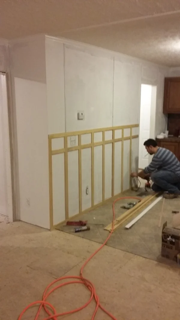 The guys also finished installing my DIY wainscoting! The board and batten design mimics the top of the built-in and I hope will help to define the dining area in the eat-in kitchen (no dedicated dining room in this house). Here it is primed; I can't wait to see it with wall paint and glossy white trim paint.
