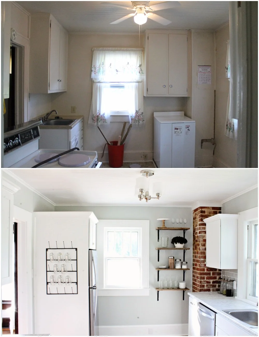 The above before/after shot is probably one of my favorites because you can see all the way to the front of the house. I really tried to get as much storage out of this little kitchen as humanly possible so we added a cup/mug rack to the side of the fridge (this also helped break up the sea of white on the fridge cabinet). You can see what I mean about having to be very precise with cabinet measurements when you look at the stove corner. We had 1/2" of clearance to spare between the cabinet and the door casing! I wish you could see the other side of the stove - we had *juuuussstttt* enough clearance for the oven door to open, lol.