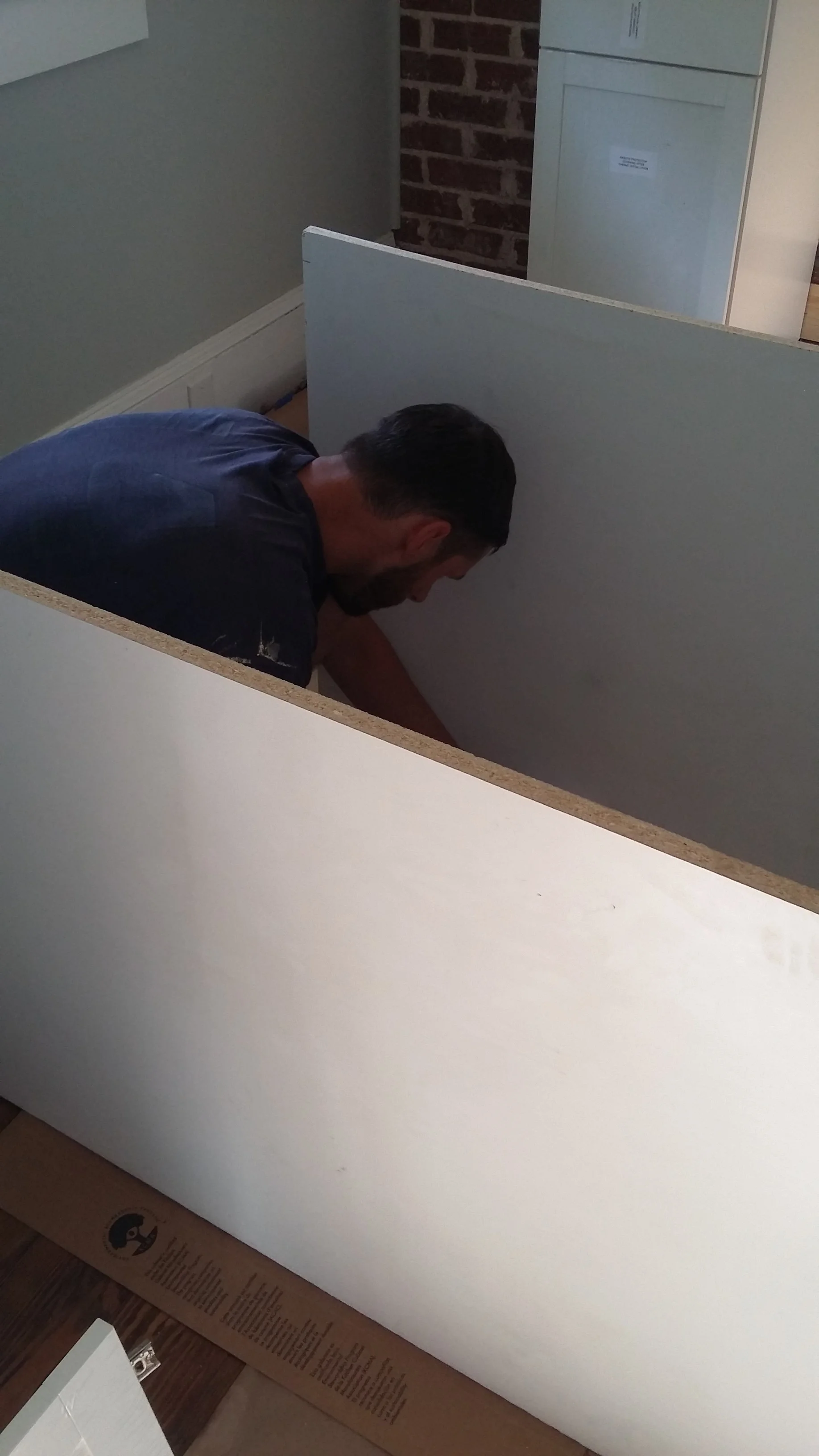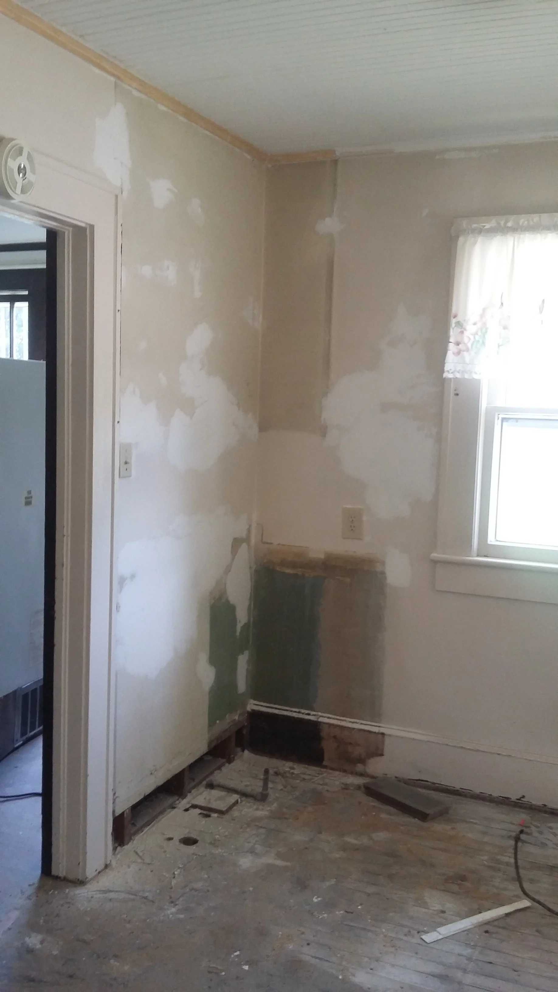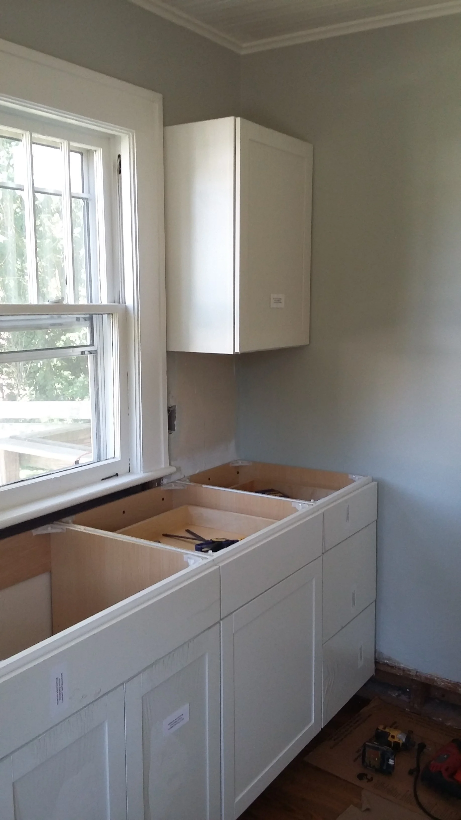 I don't think that this kitchen layout could have been more awkward! I don't know how anyone cooked in here before because there was almost no counterspace. By relocating the sink to the window, it seems like a much more natural layout, provides way more prep space, and creates a working triangle which was important in this small of a kitchen. You can also see we now have a dishwasher and fridge in the kitchen! Hooray! That clunky hot water heater was chucked and replaced with a standard hot water heater in the crawlspace.