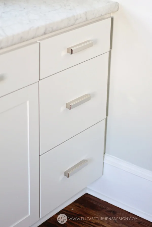 Another favorite finish is this kitchen are the budget friendly counters. We went with my trusty Formica marble laminate counter top but switched it up with a different pattern. For this kitchen we chose Formica Carrara Bianco. I chose this style because out of all of my samples, this seemed to have the most pure white background (an important consideration when you are doing white cabinetry) and because the repeat is pretty small which is best for a small space. Since we didn't have to order much material, I splurged an extra $40 on a fancier edge. We went with the double rounded edge (slightly rounded on the top and bottom). I think this is the closest edge to resembling actual stone.
