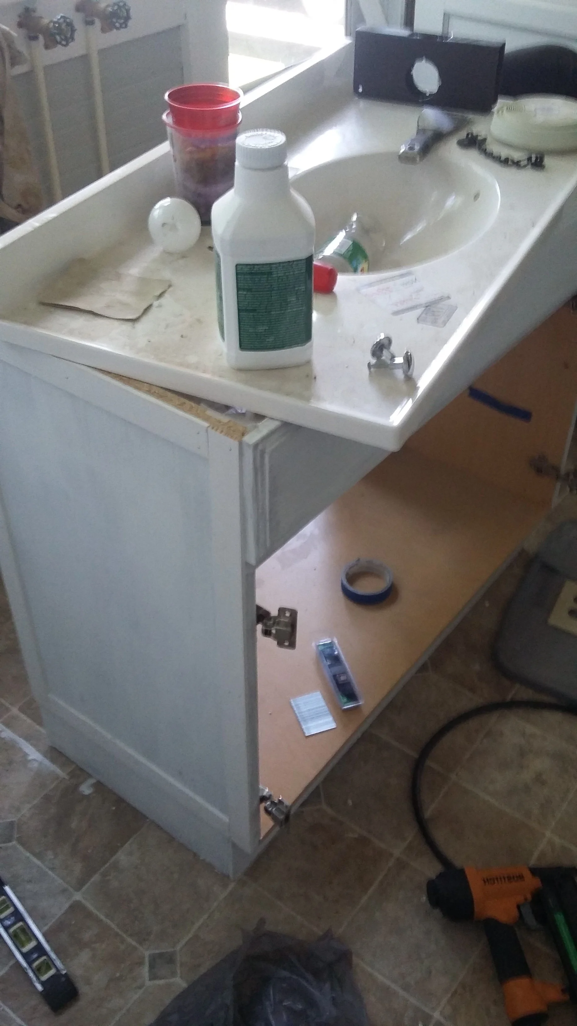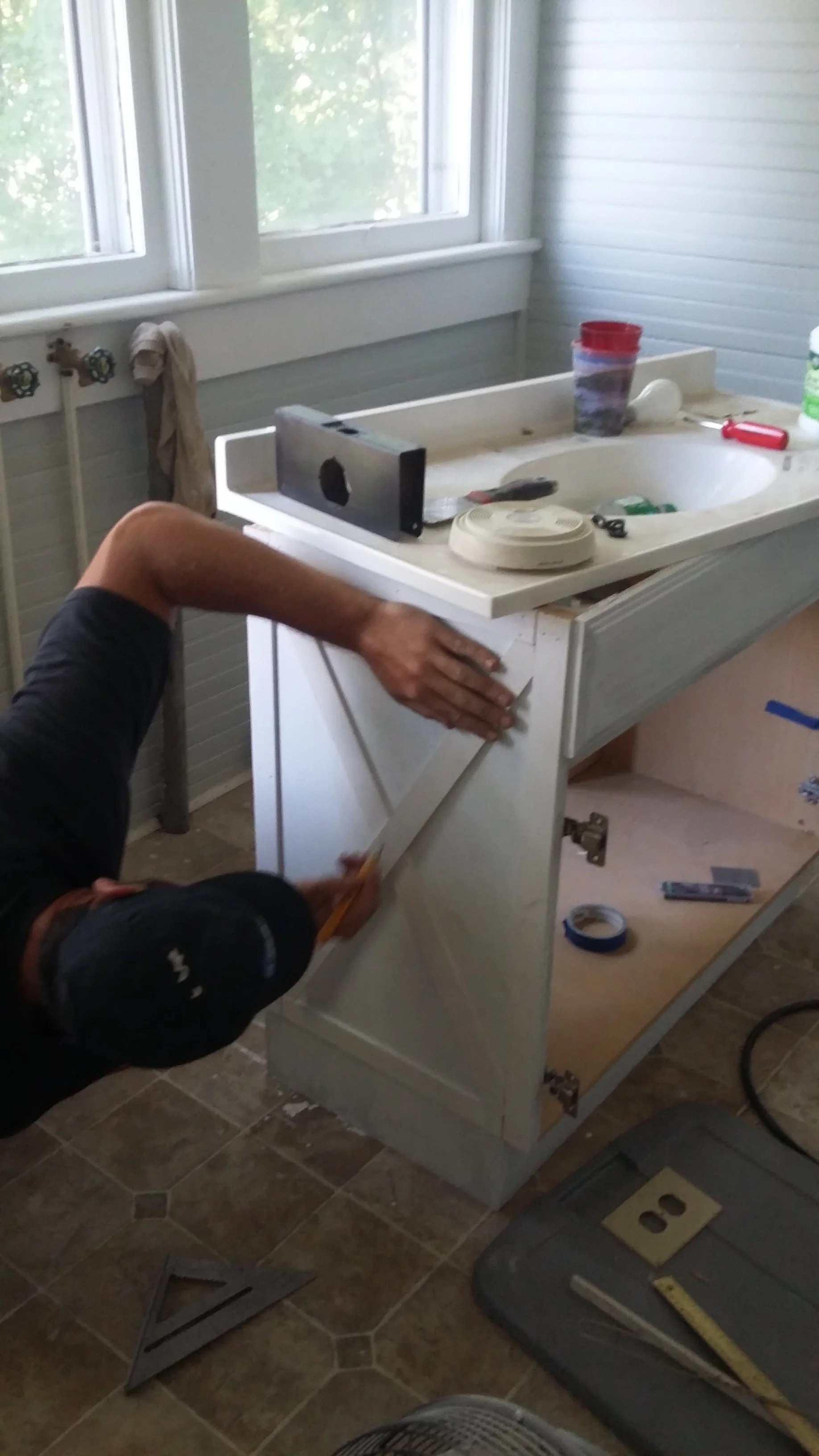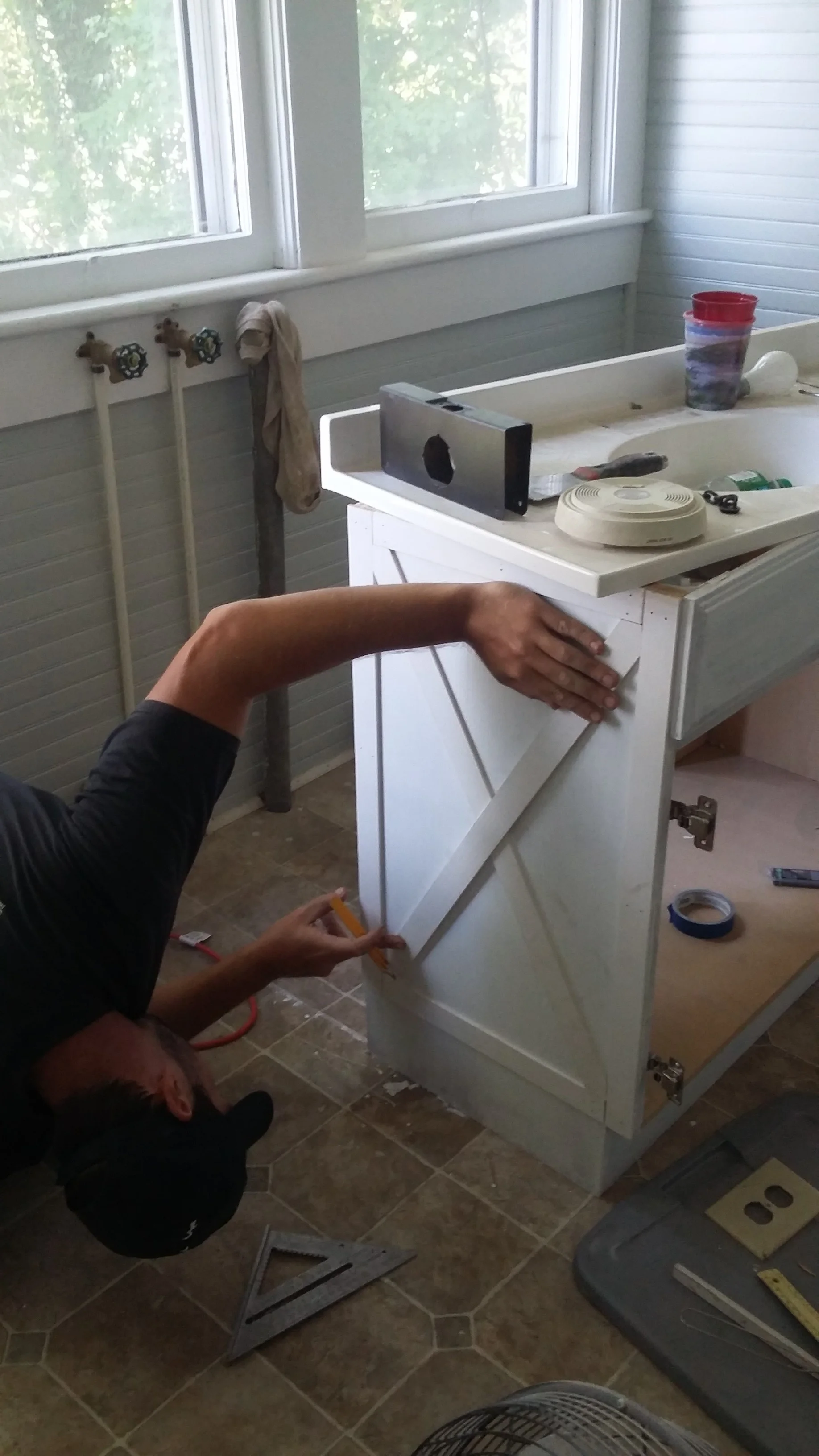 We purchased some pine lattice trim to create the X. We use this trim often for wainscoting and other millwork projects because it is dirt cheap and has a nice thin profile. This trim also comes primed which is great and allows your paint to go on smooth like buttah. Depending on the size of your island or cabinet, you may want to choose a wider lattice stip to match the scale. For example, for the vanity we chose a 2.5"W trim since the depth of the cabinet was only 18". However, for my parents' island (which is 30"D) we used a 3"W trim. You can see the progress of their 90s kitchen makeover below (getting close to being done!):